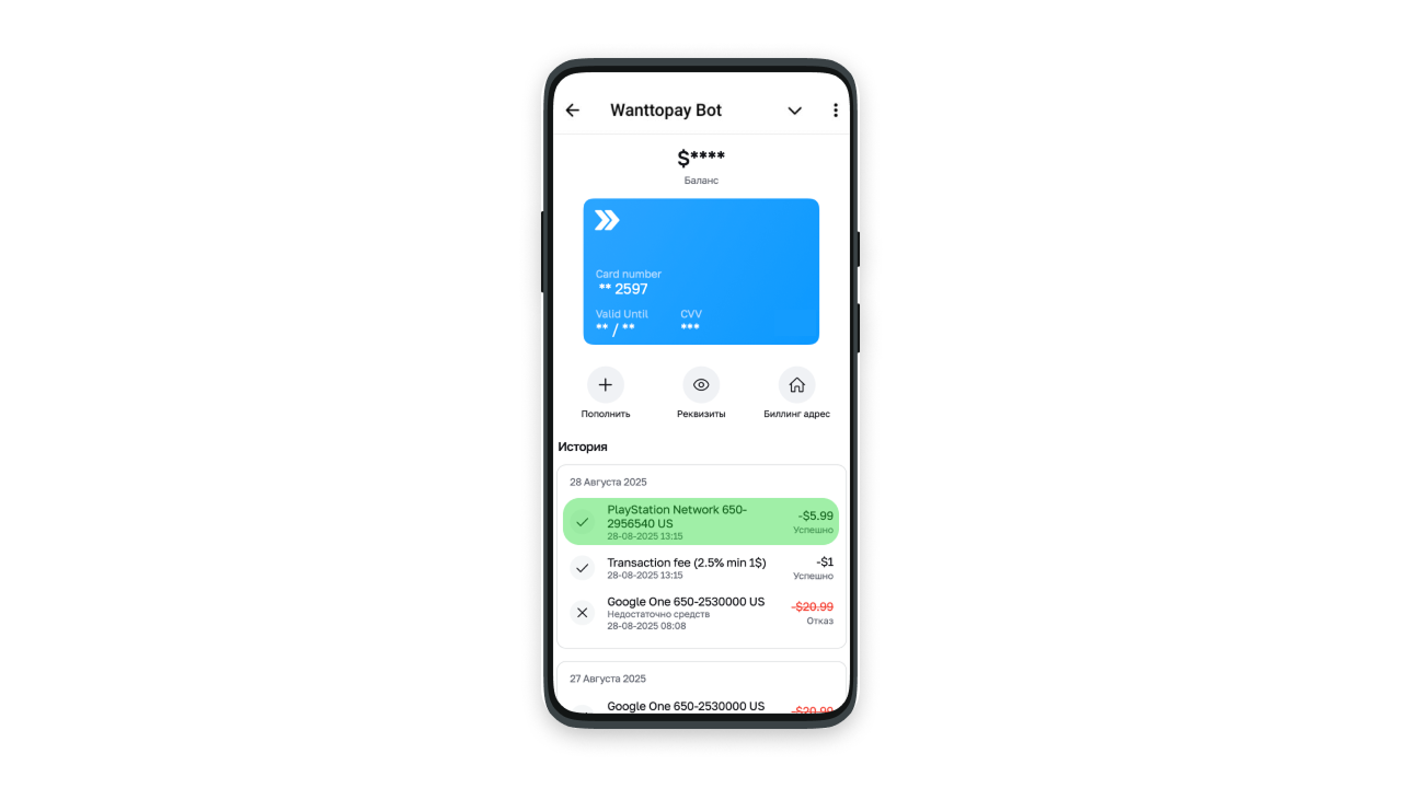 1. Виртуальная карта Wanttopay.