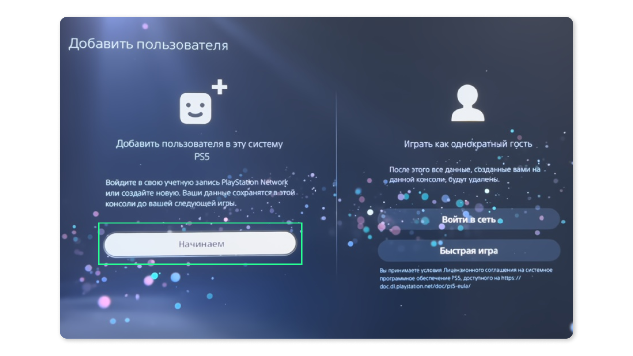 - Включите консоль и зажмите клавишу “PS”, в новом окне выберите “Начинаем” и далее примите пользовательское соглашение PlayStation 5.