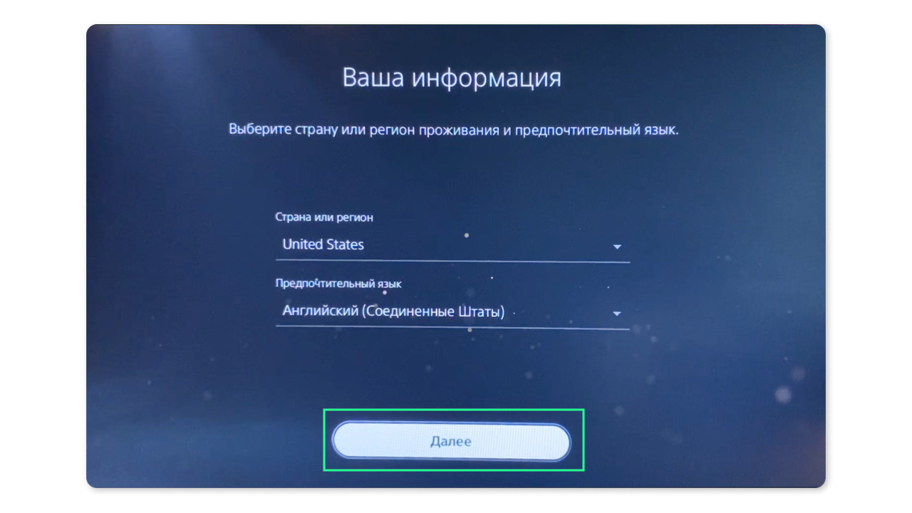 - Выберите страну США согласно биллингу вашей карты и язык который вам будет удобен. Нажмите “Далее”.