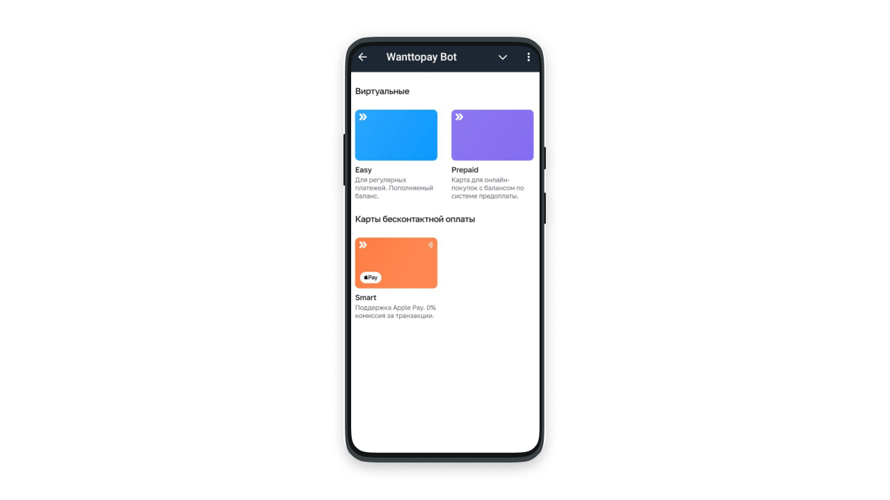 Чтобы ознакомиться со всеми возможностям карт Wanttopay, мы рекомендуем посетить наш официальный сайт, там вы сможете ознакомиться со всеми тарифами, условиями и оформить такую карту в удобном мини-приложении Telegram.