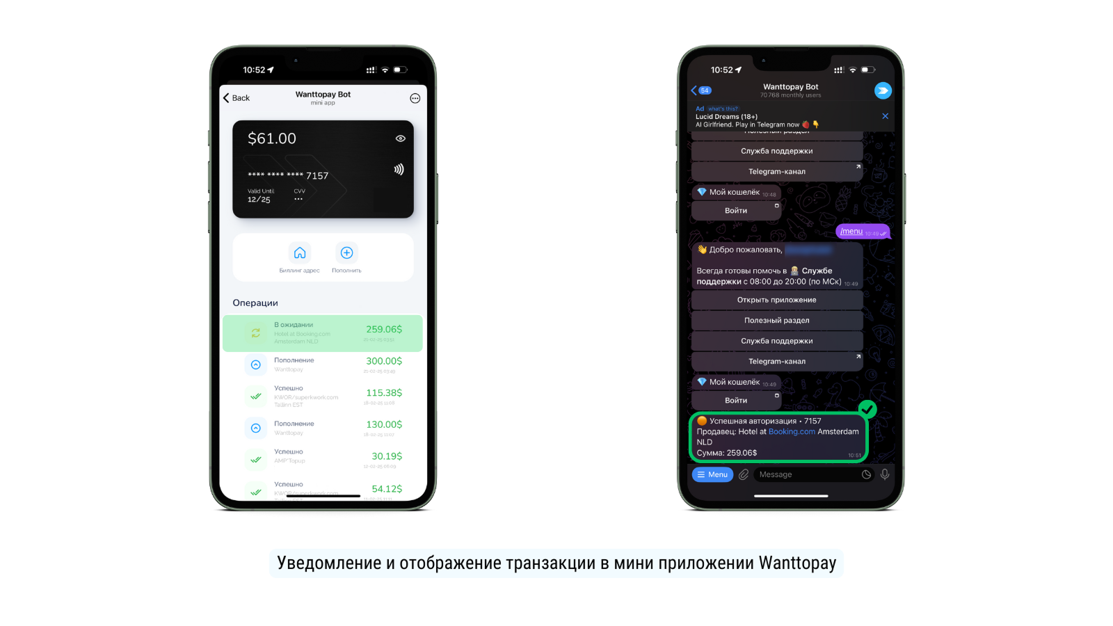 Транзакции об успешной покупке также отобразятся в мини-приложении @WanttopayBot. Узнать все подробности о приложении можно по этой ссылке.
