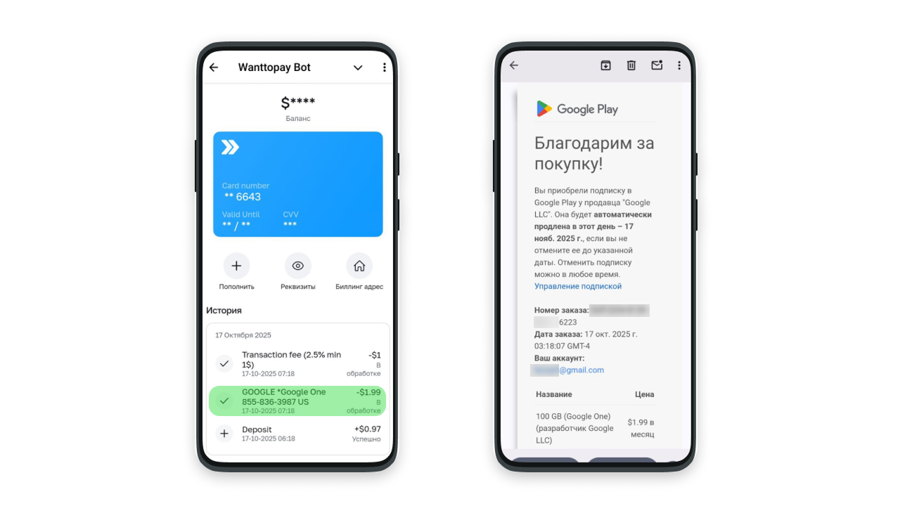 Простое решение в данной ситуации - виртуальная карта Wanttopay. Это удобный способ оплатить подписку Google One без ошибок и блокировок. С помощью Wanttopay вы можете оплатить любой уровень подписки на инструменты Google. Подключение занимает всего несколько минут прямо в мини-приложении в Telegram.