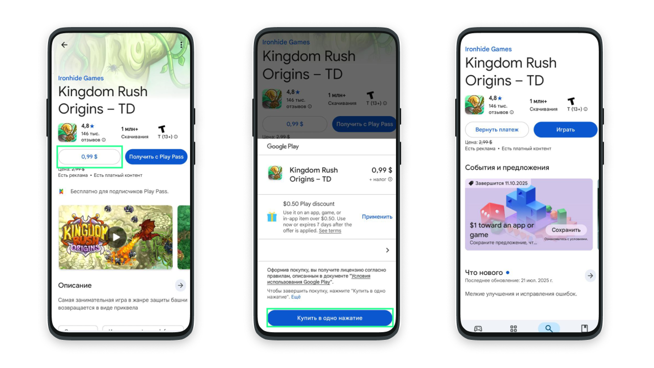 После настройки платежного профиля вы можете приобретать контент в Google Play. Мы покажем как это сделать быстро и просто на примере небольшой покупки.