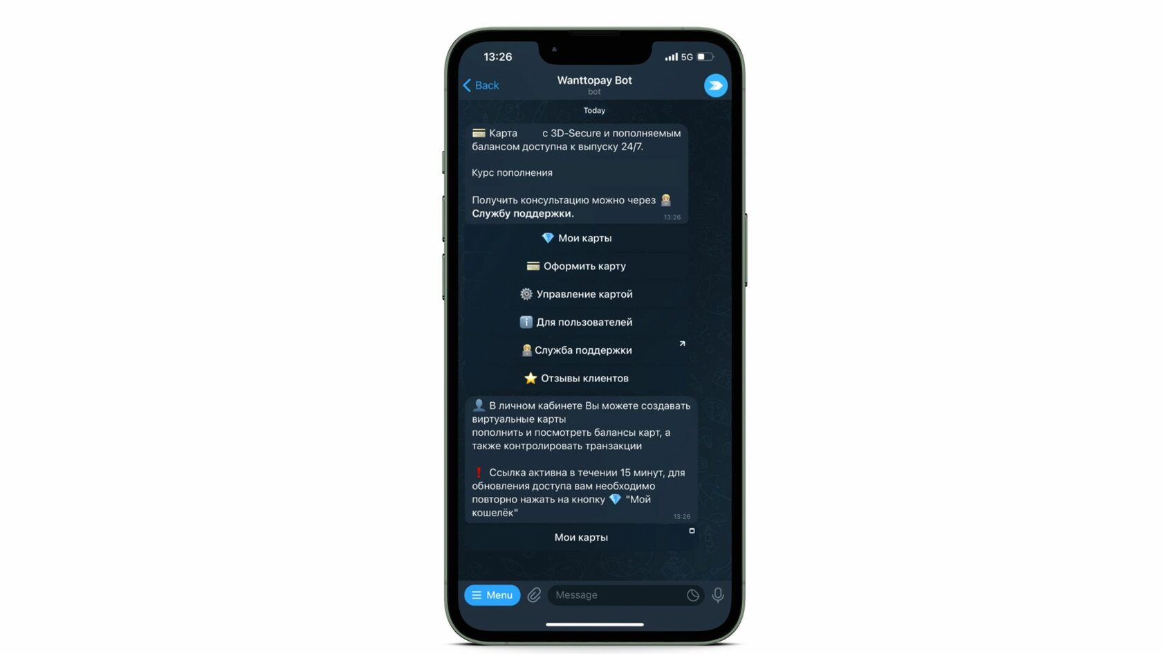 Главное меню чат-бота Wanttopay выглядит привычным для нас всех образом и состоит из 6 разделов. Для того чтобы оформить виртуальную карту необходимо перейти в раздел "💎 Мои карты". Вы получите ссылку для входа в личный кабинет, которая будет активна в течении 15 минут. Для того чтобы повторно зайти в личный кабиент, просто обновите ссылку.