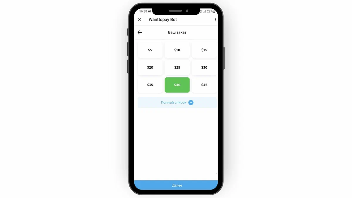 Главное меню чат-бота Wanttopay выглядит привычным для нас всех образом и состоит из 6 разделов: