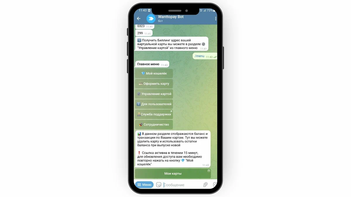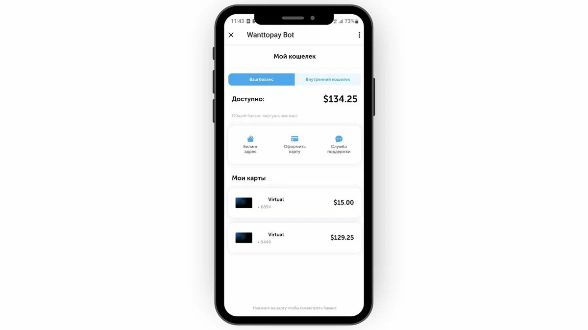 Для удобства пользователей на сервисе Wanttopay предусмотрен личный кабинет, где вы можете контролировать свои расходы, управлять виртуальными картами или выпустить новую. Все это реализовано в Telegram Web Apps (Веб-приложения внутри телеграм).