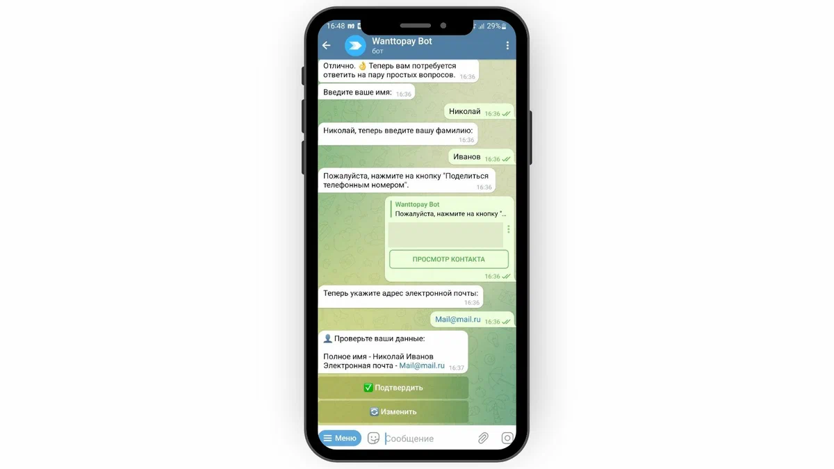 В процессе регистрации ваc попросят указать Имя, Фамилию, адрес электронной почты и контактный номер. Эти данные потребуются для восстановления доступа к вашему кошельку, если вы смените аккаунт Telegram или потеряете к нему доступ.