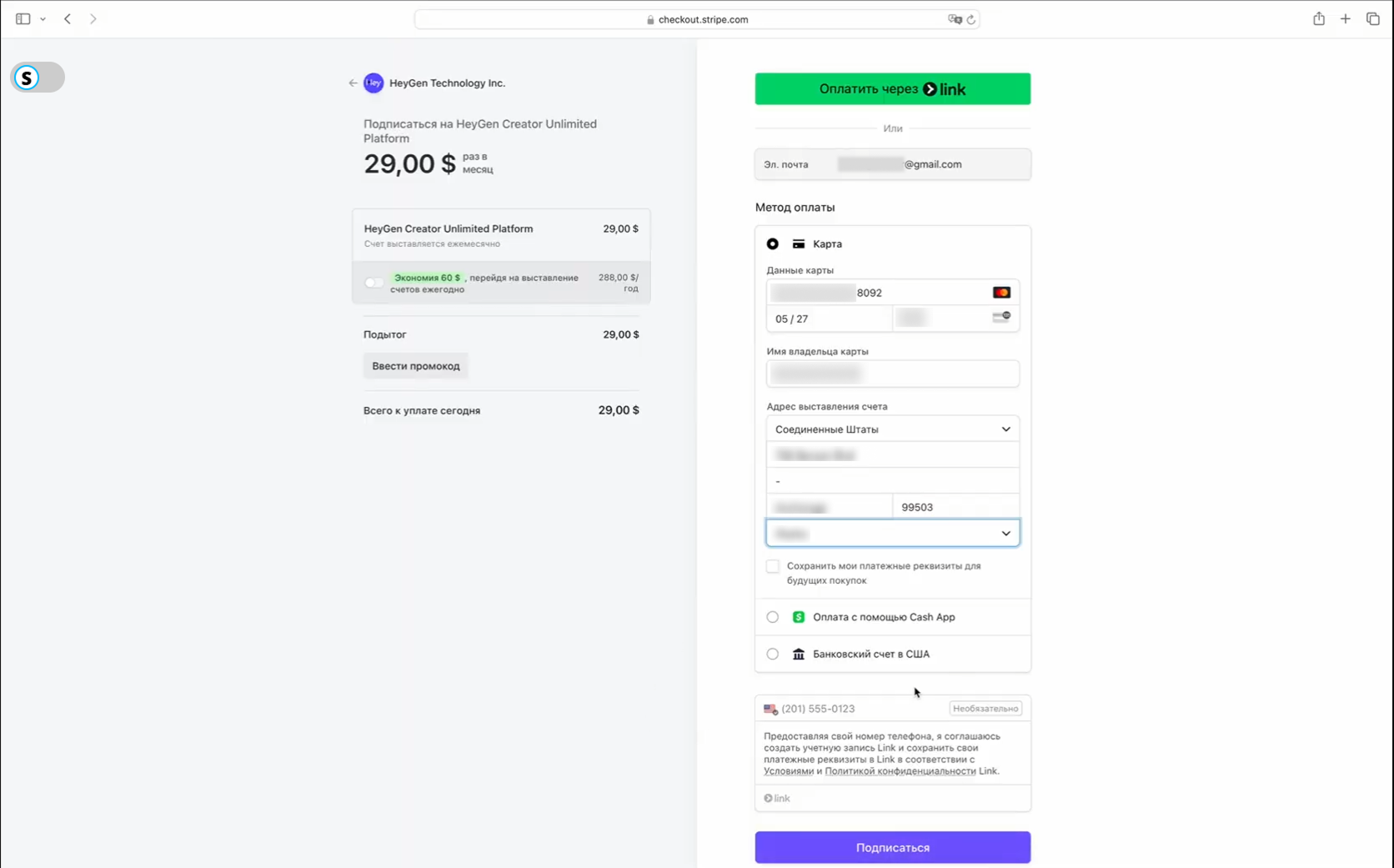Для оплаты HeyGen вам потребуется: