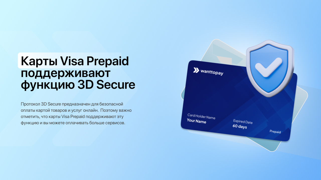 Стоит отдельно отметить поддержку 3D Secure, благодаря её наличию на карте Prepaid, данный тип виртуальной карты имеет более широкие возможности для оплаты на зарубежных сервисах.