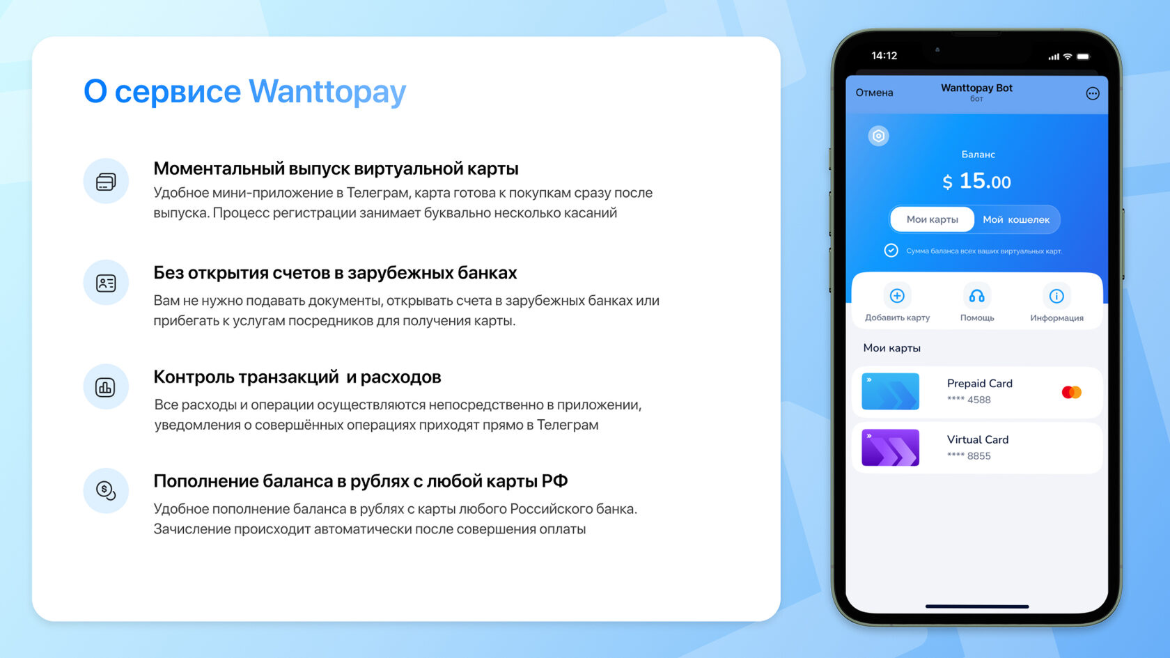 Чтобы ознакомиться со всеми возможностям карт Wanttopay, мы рекомендуем посетить наш официальный сайт, там вы сможете ознакомиться со всеми тарифами, условиями и оформить такую карту в удобном мини-приложении Telegram.