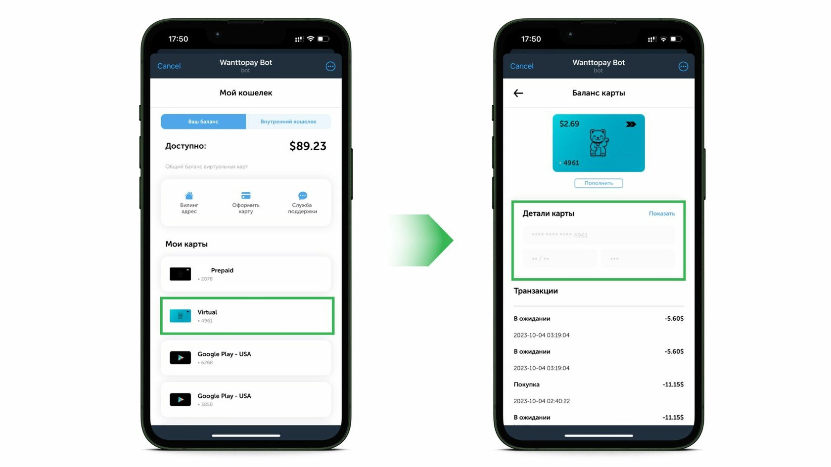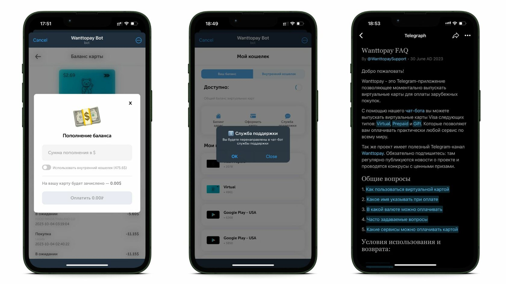 Достаточно нажать на кнопку "Начать" → "Открыть меню", чтобы запустить чат-бота Wanttopay. Именно с его помощью вы сможете в любое удобное время выпускать платежные карты которые подходят для оплаты на зарубежных онлайн севрисах, а так же покупки билетов, бронирования гостиниц и т.д...