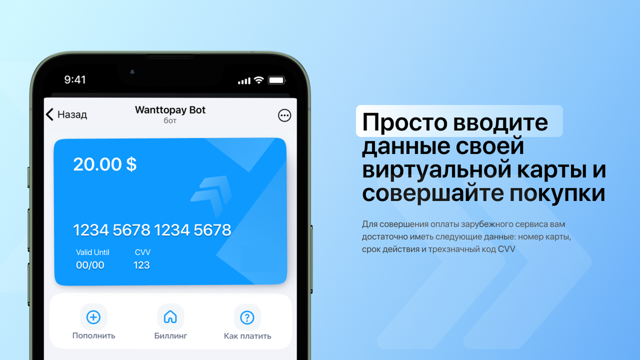 Особенности виртуальных пополняемых карт: - Выпускаются в валюте доллар США - Срок действия пополняемых карт до 12 месяцев - Возможность пополнения баланса в фиате и криптовалюте USDT - Карта поддерживает автоматическую верификацию 3D Secure - Контроль транзакций и совершаемых покупок - Плата за подписку по карте составляет - 990*или 6$.