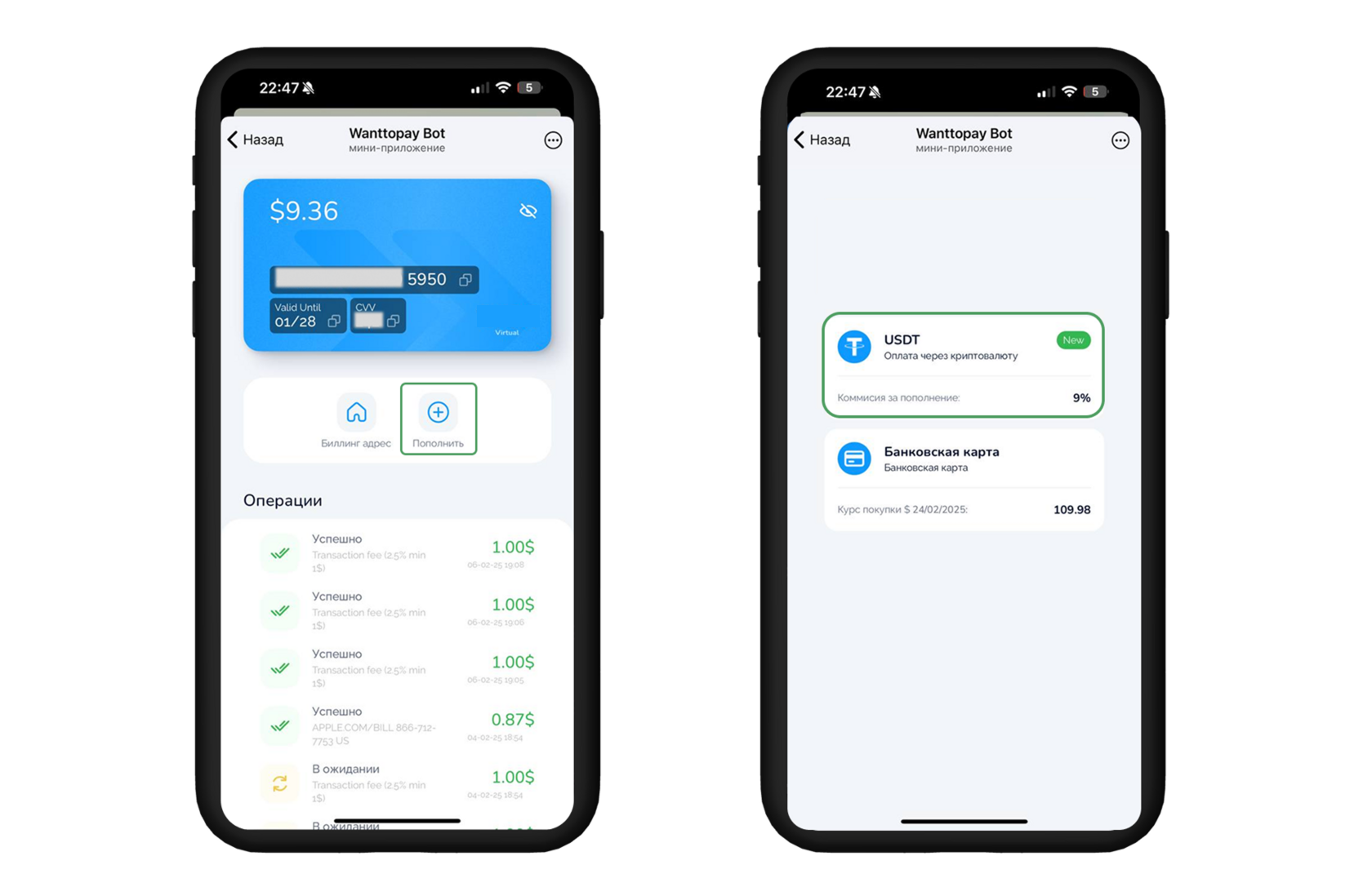 Важно: Пополнение в USDT доступно только для карт с тарифами Easy и Pro.