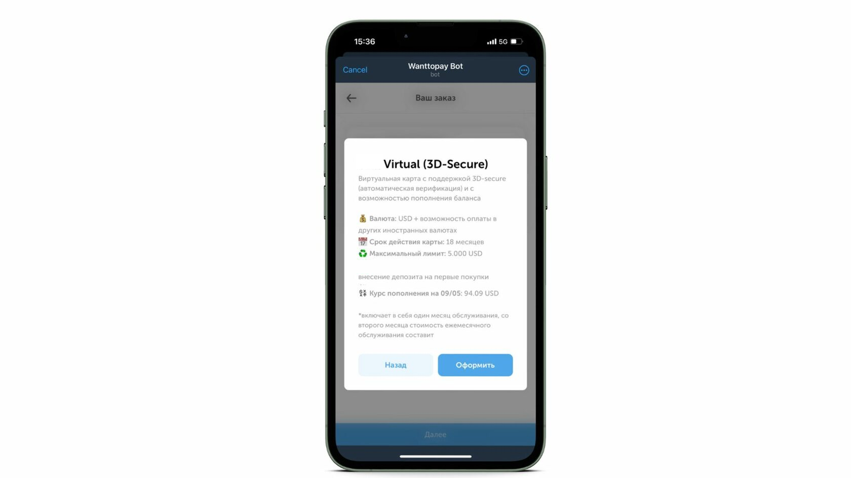 За 3 дня до окончания подписки вы получите сообщение от чат-бота Wanttopay со ссылкой на оплату подписки. В случае если оплата по ссылке не будет осуществлена, то произойдет автоматические списание с баланса виртуальной карты по курсу доллара США на день списания. Если на балансе карты недостаточно средств для списания, то будет осуществлена заморозка виртуальной карты. Для того чтобы вновь начать пользоваться виртуальной картой, необходимо внести ежемесячную плату за обслуживание.