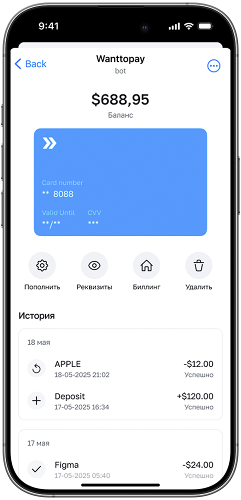 Чтобы ознакомиться со всеми возможностями карт Wanttopay, мы рекомендуем посетить наш официальный сайт, там вы сможете ознакомиться со всеми тарифами, условиями и оформить виртуальную карту в удобном мини-приложении Telegram.
